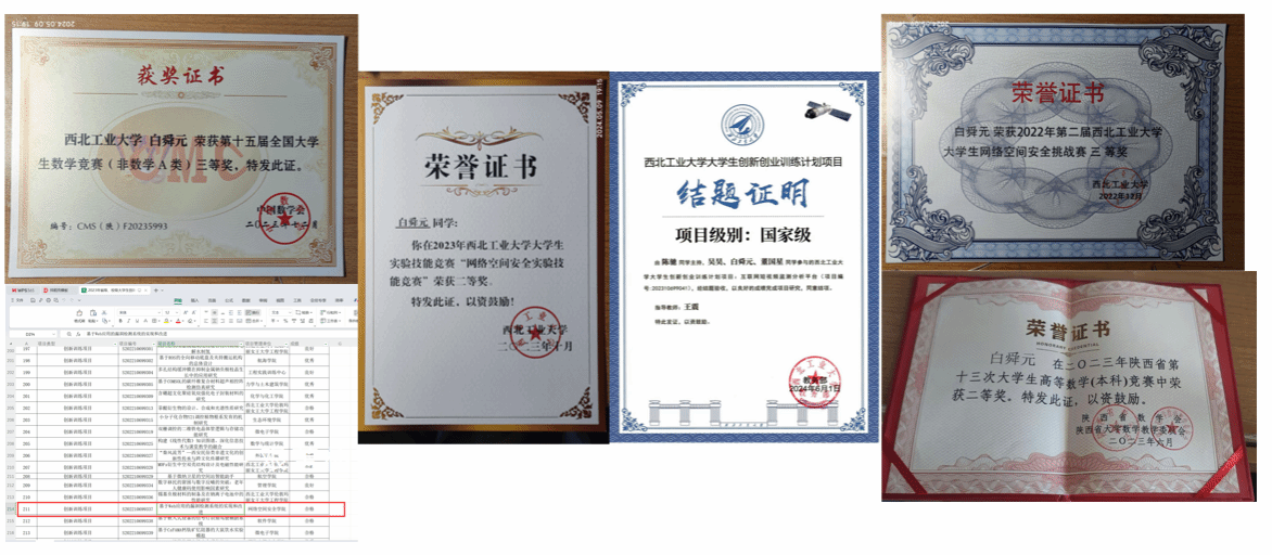 在课余时间,白舜元积极参与各类科研项目与学科竞赛,为培养自己具有较强的科研素养、创新意识和实践能力做好准备,曾作为核心成员,参与并结题国家级大创《互联网短视频监测分析平台》与省级大创《基于Web应用的漏洞检测系统的实现和改进》,并在基础学科类竞赛例如高等数学,专业技能竞赛等竞赛中取得优异成绩。